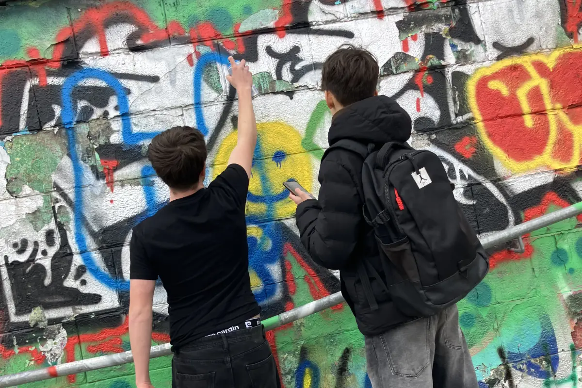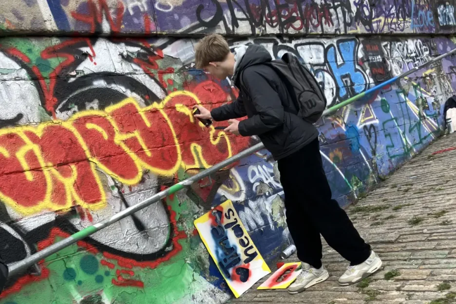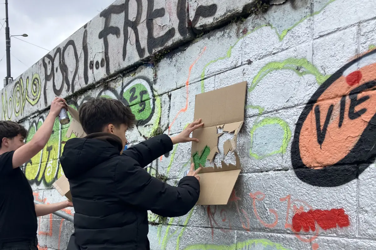 Unser nächster Programmpunkt führte uns zum Donaukanal, wo wir unsere eigenen visuellen Spuren im urbanen Raum hinterließen. Bestens vorbereitet, kamen unsere kreativ gestalteten Schablonen zum Einsatz.