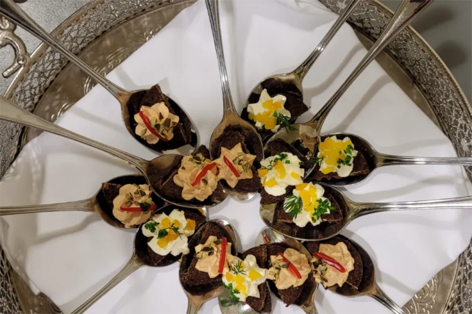 Die Gäste wurden gleich zu Beginn mit einem herzlichen Gruß aus der Küche, Frischkäsebällchen, begrüßt. Es folgte eine Bärlauchcremesuppe. Als Hauptgang wurde Hühnerfilet mit einer Nusskruste serviert, begleitet von einem Kräuter-Erdäpfelpüree und Ofengemüse. Als vegetarische Alternative gab es Pilze, ebenfalls in einer Nusskruste. Den süßen Höhepunkt des Abends bildete ein Cheesecake à la HLW mit einem Glücksspruch auf dem Teller.